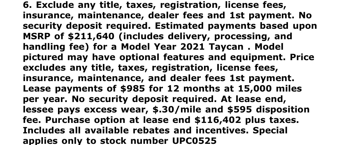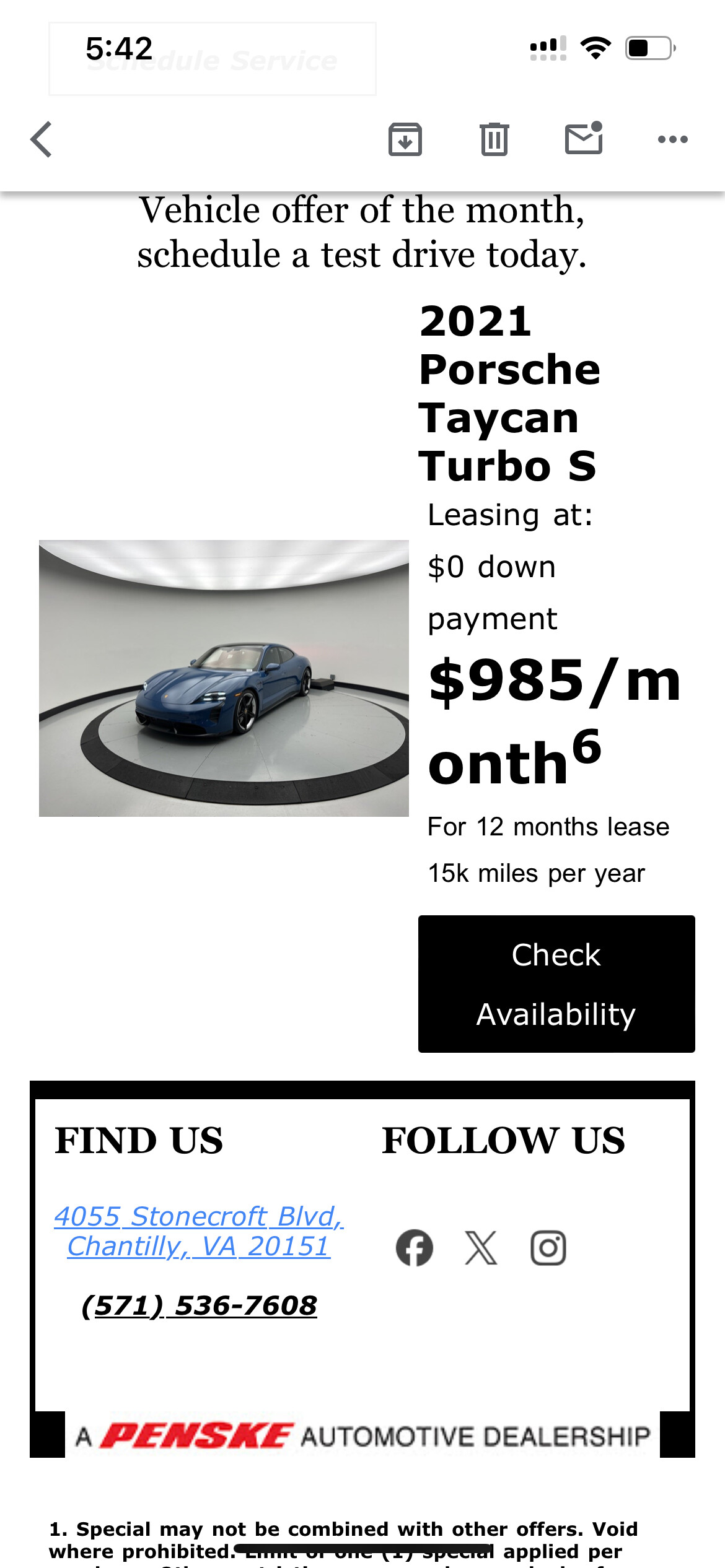 I’m not interested due to Virginia taxes on the whole price, but if someone wants a ripper of an ev for a short period without worrying about depreciation this seems pretty solid to me. Located at Porsche of chantilly. Hopefully someone gets this.