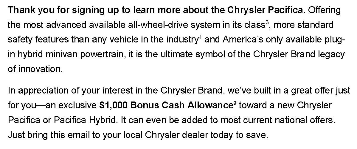 The terms for the redemption code say: “In appreciation of your interest in the Chrysler Brand, we’ve built in a great offer just for you—an exclusive $1,000 Bonus Cash Allowance toward a new Chrysler Pacifica or Pacifica Hybrid. It can even be added to most current national offers.”