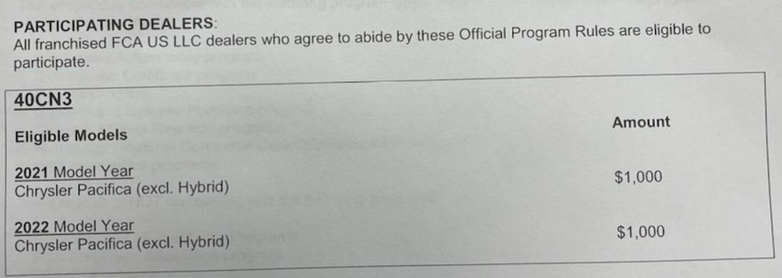 I sent the $1k bonus cash redemption code to a popular dealer this weekend. The response was “Unfortunately, the true car is not available with the Hybrid Pacifica. Please let me know how to proceed.”