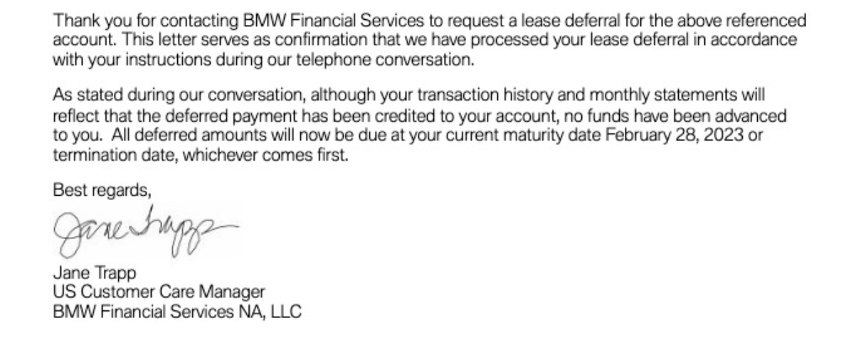 This deferral does not change the maximum amount of mileage you are allowed to drive the vehicle as indicated in your lease agreement and you are responsible for any registration due, insurance, etc.