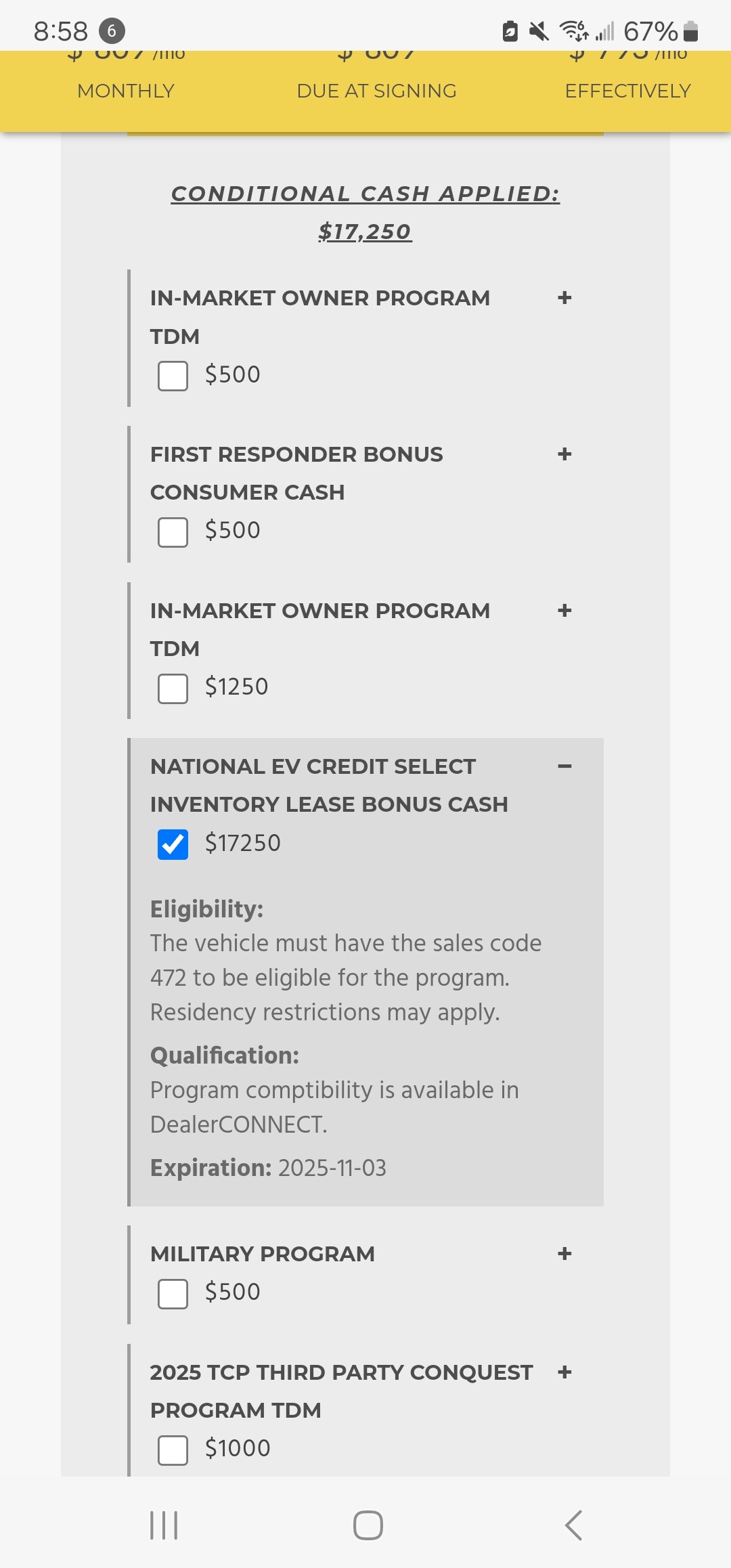 Stellantis has 20K worth of incentives on a lot of their vehicles right now. I can get 23K on a Hornet with loyalty and TDM. But, it does not matter since the money factor and residuals listed on the calculator are actually what SFS is charging for leases right now. I spoke with a CDJR dealership today to confirm this ridiculousness. I get it not being 0.31% anymore. But, over 16% is obscene. 6.99% would even be reasonable. Stellantis has lost their mind.