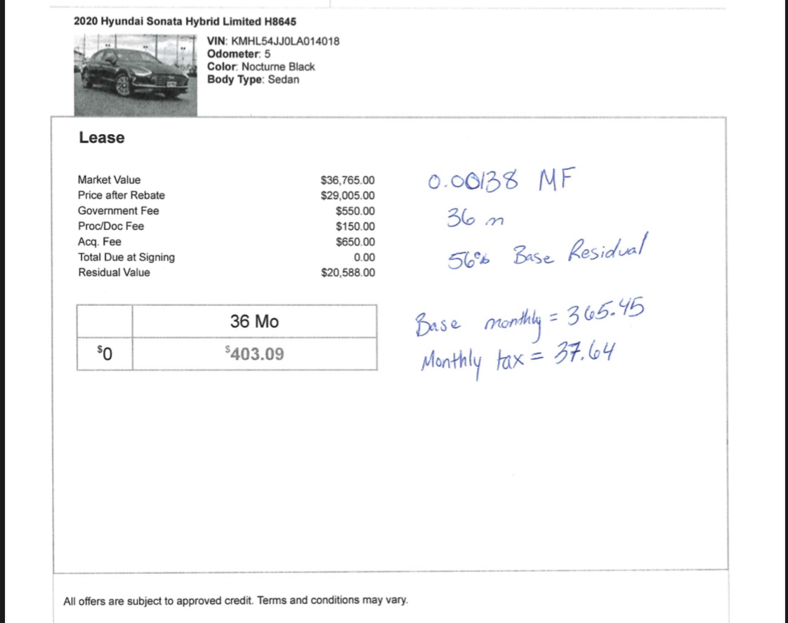 Now, I plugged in the numbers in the calculator but could not come up with the same monthly payment as the one they quoted. Either I am missing something or theres so hidden fees going on. Per dealership, govt fee, doc fee, and acquisition fee is included in the total price (after rebate). Is this normal? I thought you pay that upfront? Do you think theres some more room for the selling price to go down from the current rebated price? Let me know guys thanks!