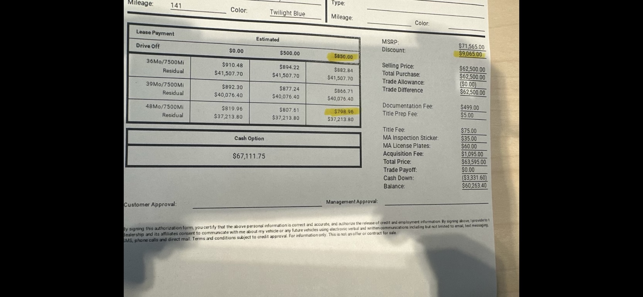 They started at $65k selling price and $773.50 monthly with $5k down. Negotiated to $0 down and $818 monthly. Maintenance included, no additional fees (tax, acquisition, documentation, etc. are all baked into monthly).