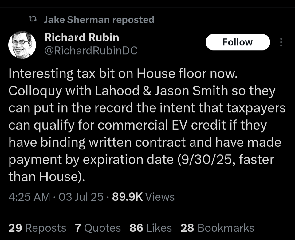 Interesting statement from House last night. Putting something in the record to try and clarify for the courts. Might be way for automakers to string out deliveries. A binding contract with down payment for delivery in the future.