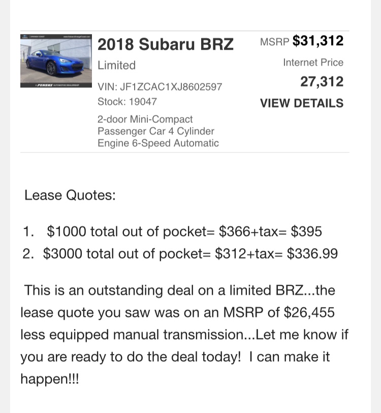 Almost 425 a month effective payment on a 31k dollar coupe who’s sales have been struggling for several years now because Subaru fails to innovate… they should be paying you to take this car, not the other way around.