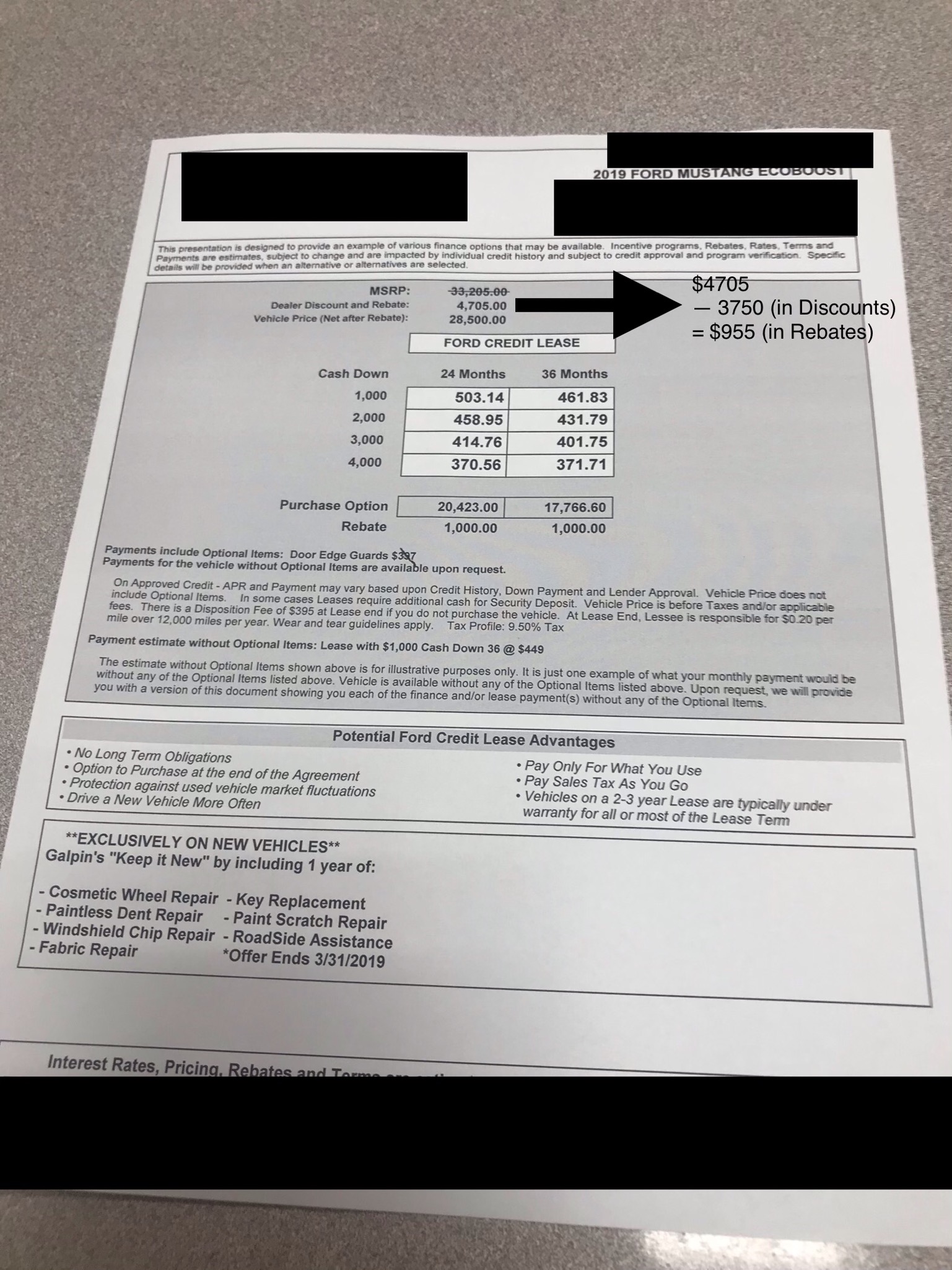 • Deal1 has insane discounts+rebates but requires a minimum of $1000 down and will likely be down payment + first month’s pay (+ perhaps some other fees) out the door and it seems like the rebate got taxed because it came out to $955 (should be $1000) according to what their manager said.