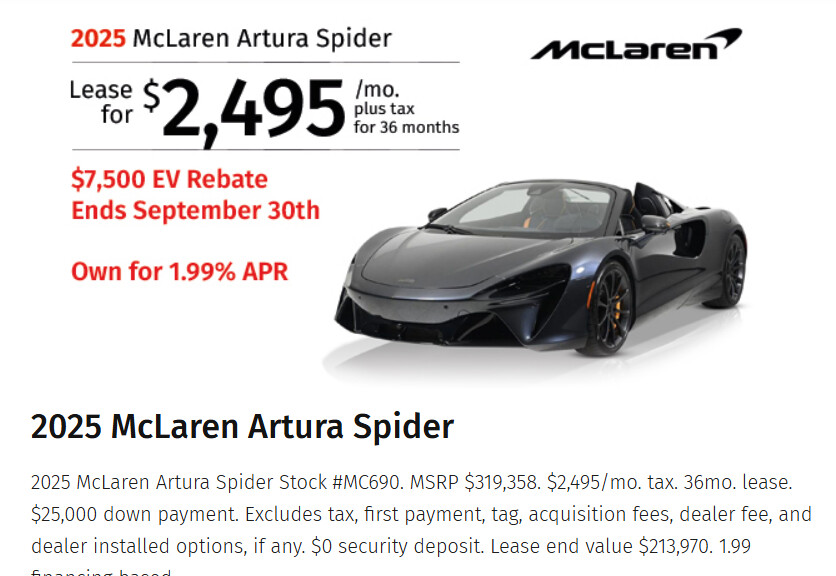 That’s why the $7,500 was available for a McLaren Artura or Mercedes-AMG GT 63 S E 4-Door Coupe with Performance 4MATIC+… which you know did almost nothing to help the environment and was only bought by people who probably don’t need $7,500 of government cheese.