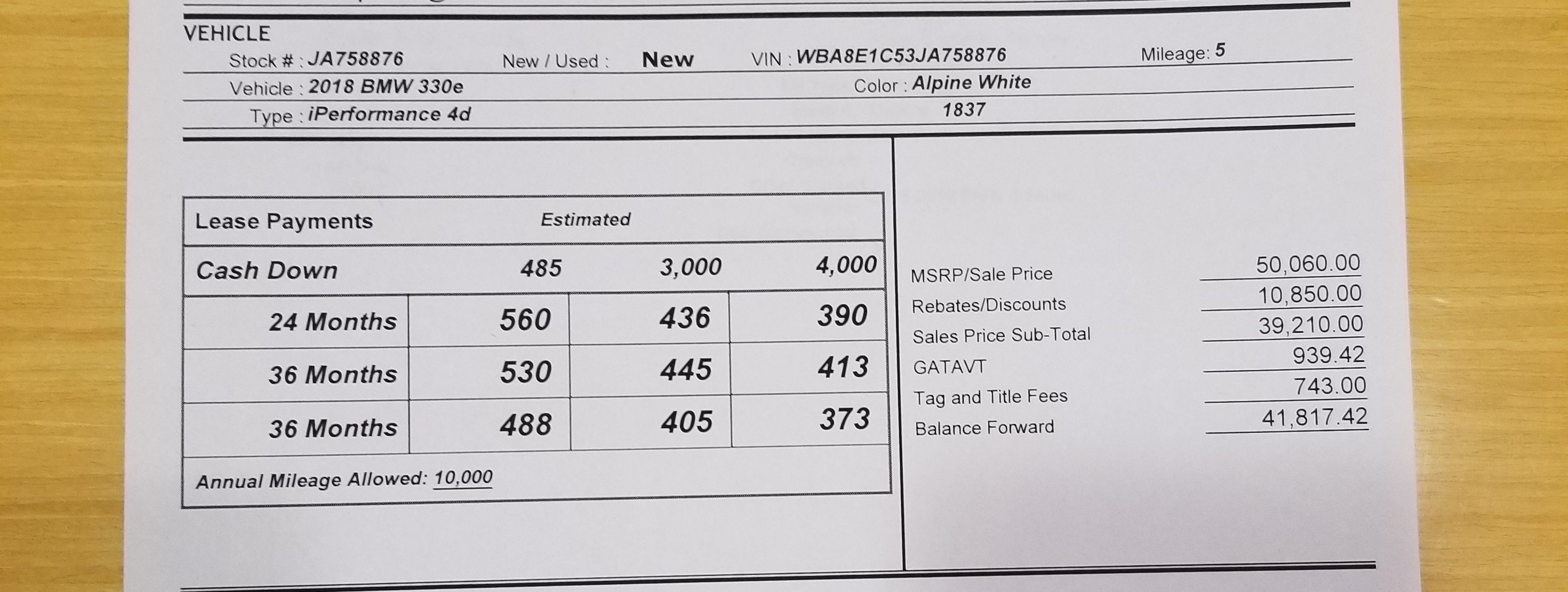 Hello all - first time and need help. In the market for a new BMW. Can some eval my deal on a new 2018 330e. Dealer advertising 20% off MSRP in GA.